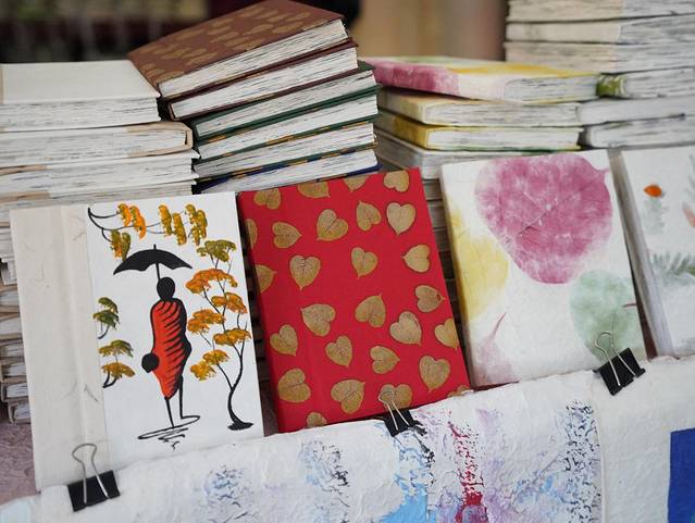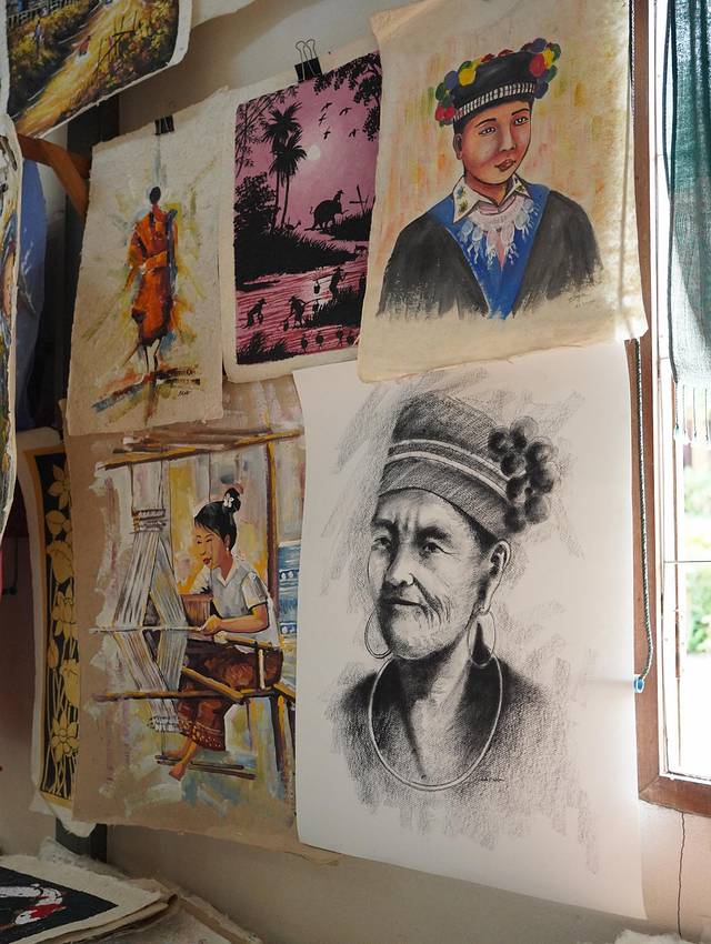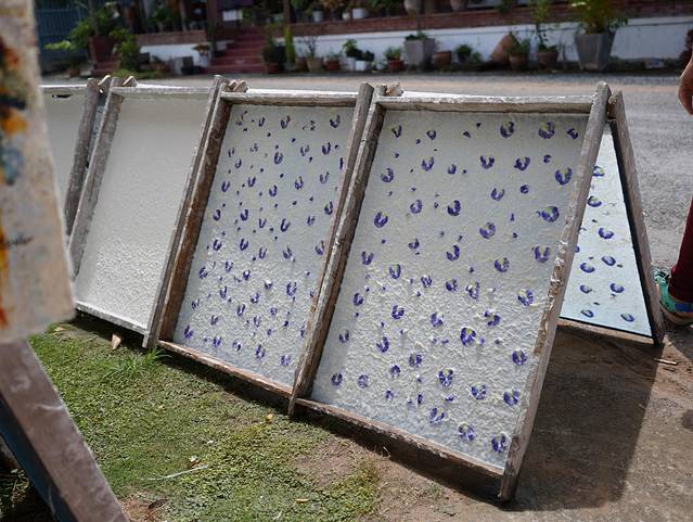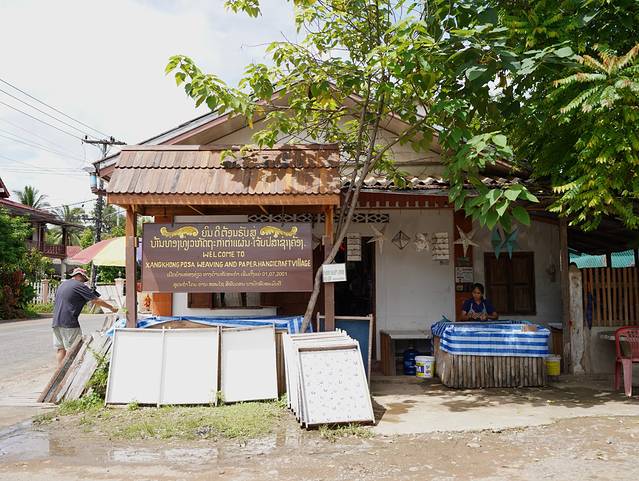 说琅勃拉邦是一处很原始的净土的体现就在于,他们还保留着一些纯手工制作的东西,比如我们去参观的纱纸工厂。就是用一种树的树枝熬制成浆后放到模版里,放上色彩鲜艳的花做装饰形成各式各样的手工纱纸。根据用途做各种裁剪,制成笔记本,墙画,灯面,请帖,信封等。价格也不贵,几块钱到几十块人民币就可以买很多。