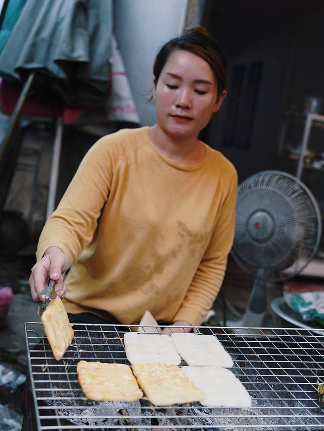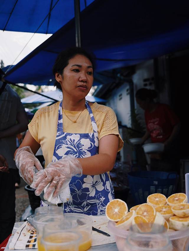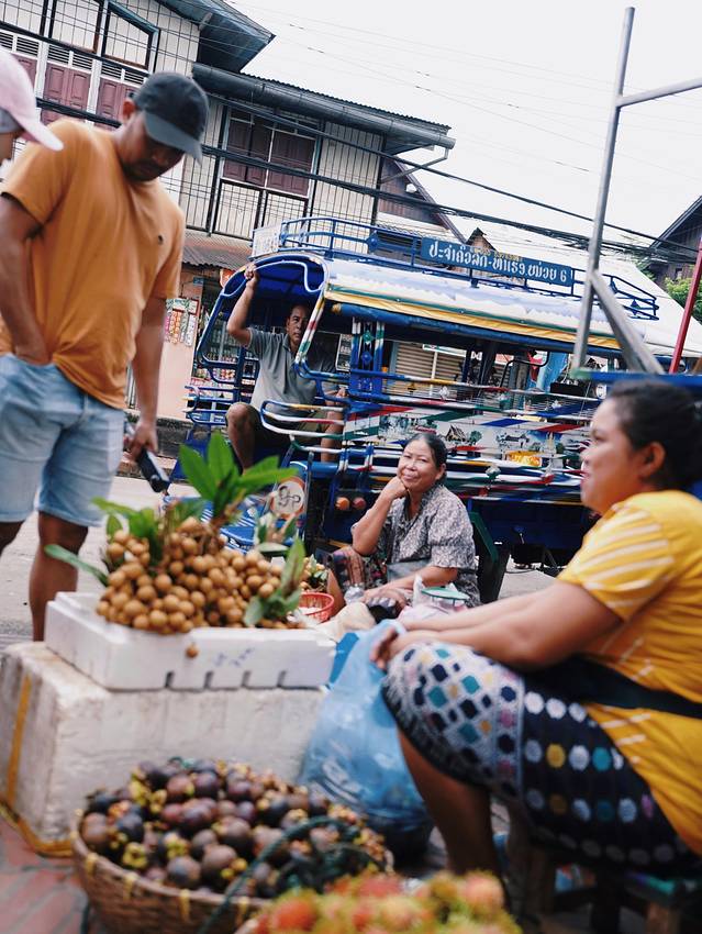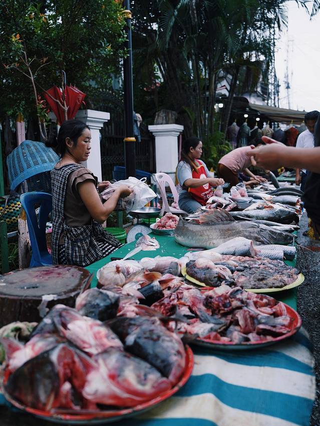 我原先以为吸引我的会是我未曾见过的老挝物产或者是很多旅游文案里渲染的“peace & smile”,而置身于早市之中心里升起的第一份感受是他们的不容易。市场上百分之八十摆摊的都是中青年女性,有的还怀抱着孩子一起出摊。他们多数人没有我在别人的文章或视频里的peace and smile。我看到的面孔有茫然,有沉重,有严肃,有羞怯,有无动于衷,有忧愁。