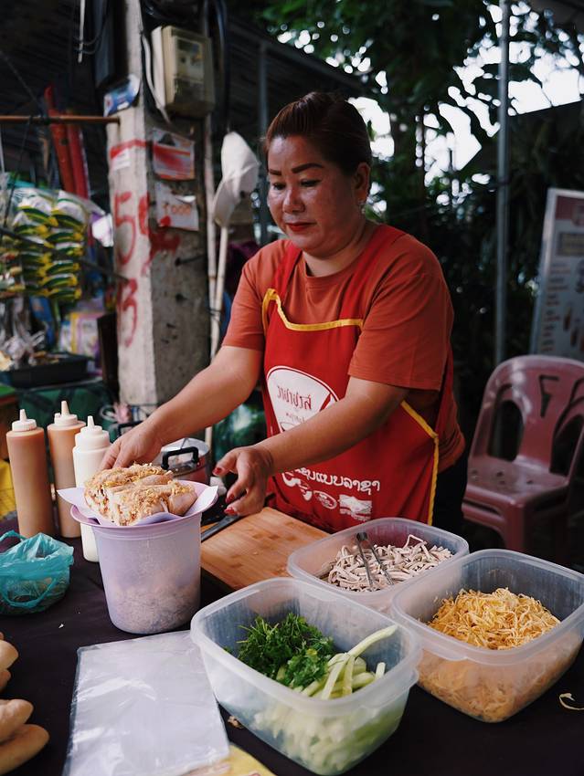 2、布施给和尚的东西可以自己准备,也可以到了现场找小贩购买,当地的一些民众会摆上椅子,一个位置200泰铢左右,为你准备好给和尚的食物,包含一竹篓糯米饭,豆奶,熟菜,鸡蛋等。