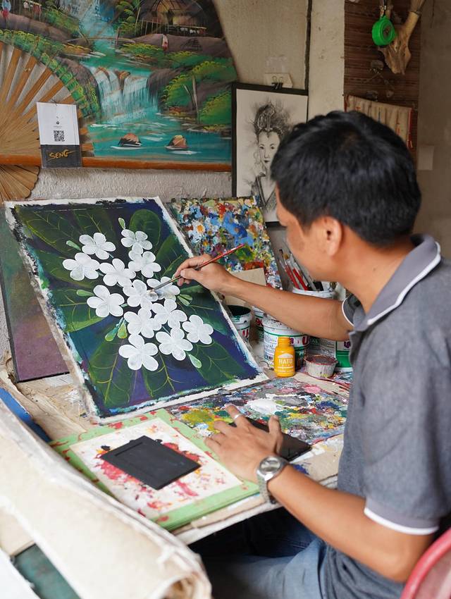 特别值得关注的是,工厂里的画师,都是不打草稿徒手作画,店里很多画都是他看心情画的。他说画画都是自学的,没有人教过,看着他一个人拿着画笔安静作画的背影,仿佛他一个人就是一个世界。