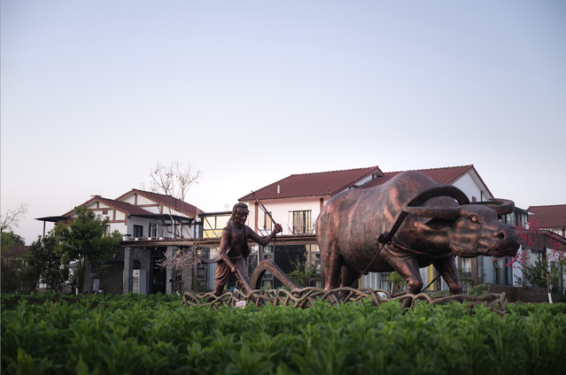 除了墙绘,村庄内还有很多民间气息浓郁的东西。田间的耕作展示,用铜牛、人像模拟了早年间村里传统劳作的生活场景,很有小时候的感觉,一下子就把人拉回到了那个久远的年代。