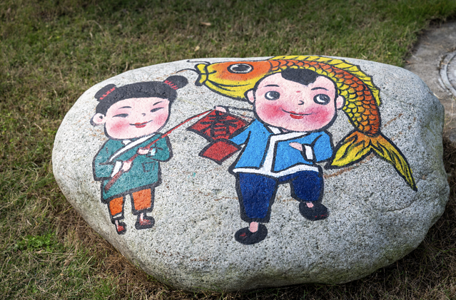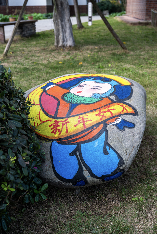 宽敞的石板路引领我们深入这个充满年俗氛围的村落。沿路而行,道路边的石块、房屋的外墙上,都画有色彩斑斓的童趣年画,简直是一个多巴胺世界。