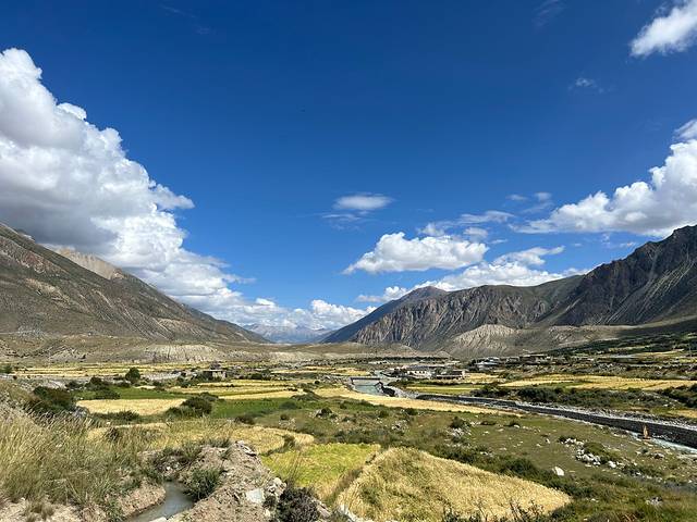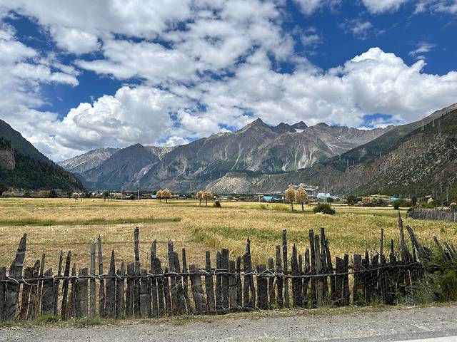 熟了的青稞地金黄金黄,跟着蓝天白云搭在一起,也是一道风景。