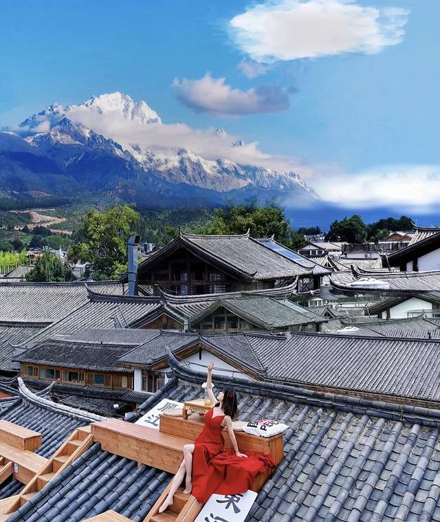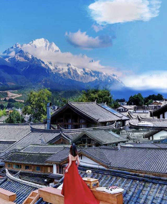 屋顶咖啡可以俯瞰数和束河古镇,也可以拍到远处的玉龙雪山!