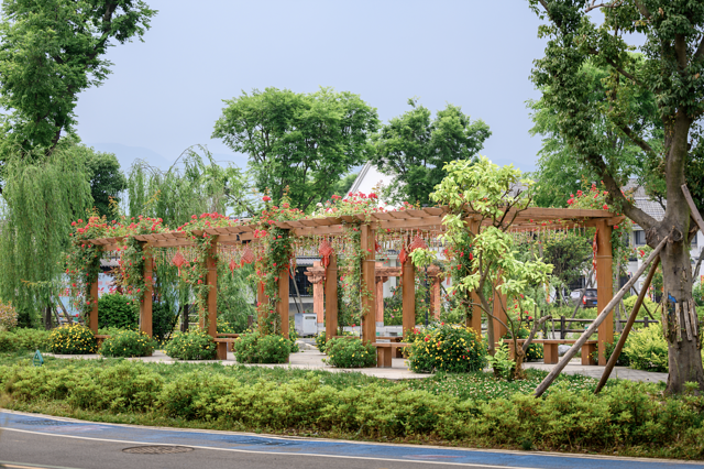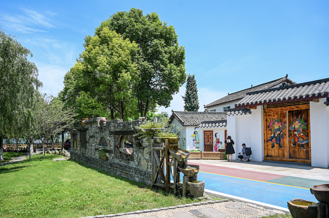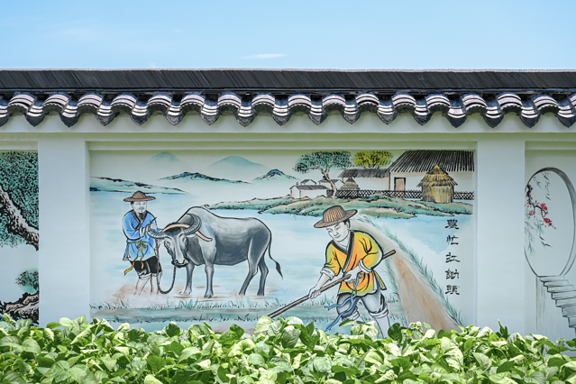 年画村里处处充满生机,早已超越了单一的年画之美,它更像是一处精致的苏式园林。沿着小径前行,两旁的景色如画卷般徐徐展开,翠绿的树枝没有经过精心修剪,却与四周彩绘的墙面相映成趣,古韵十足。