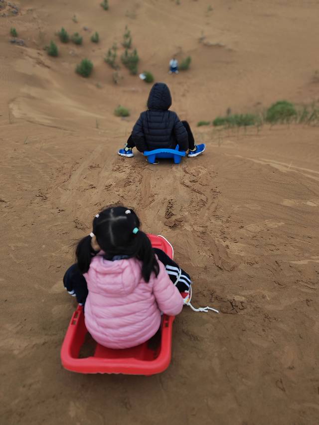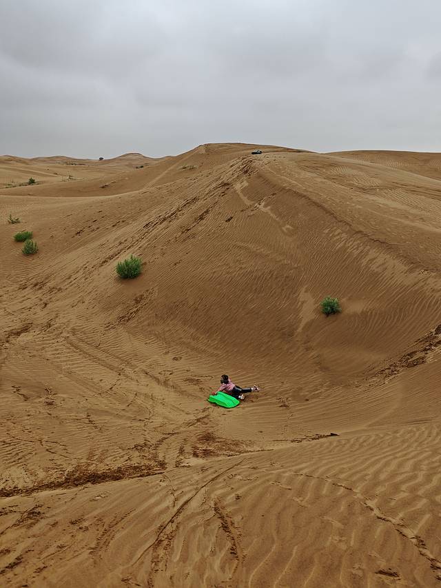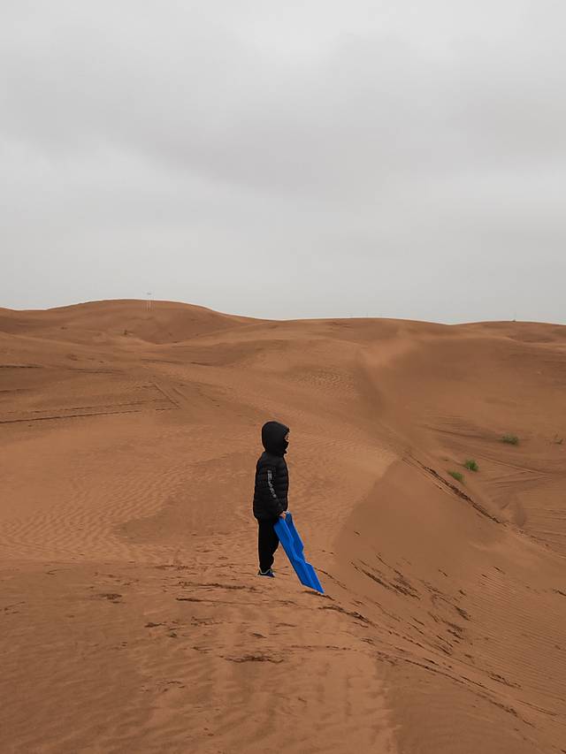 沙坡头景区摆渡车等了三分钟没来,眼守着四围一片寂静无人的沙漠,小孩儿早已按耐不住,玩就是了。抱起滑沙板,连颠带跑,从开始时试探性的拘谨滑沙,到后面一定要找到最高的那个沙包,冲下去,怎一个刺激了得,后面后面老爹老娘也按耐不住了,大家一起来~玩到地老天荒,天荒地老~