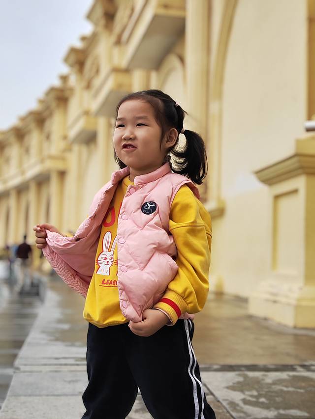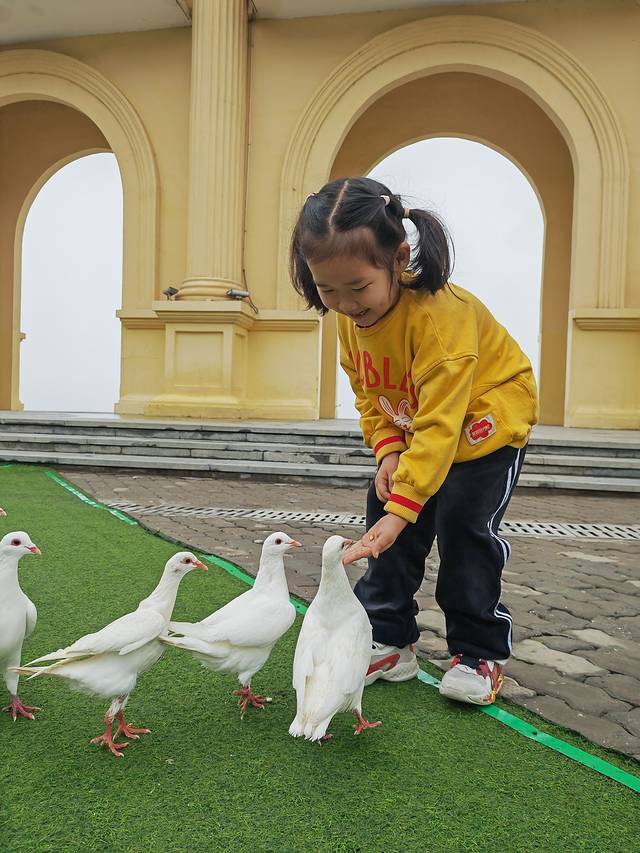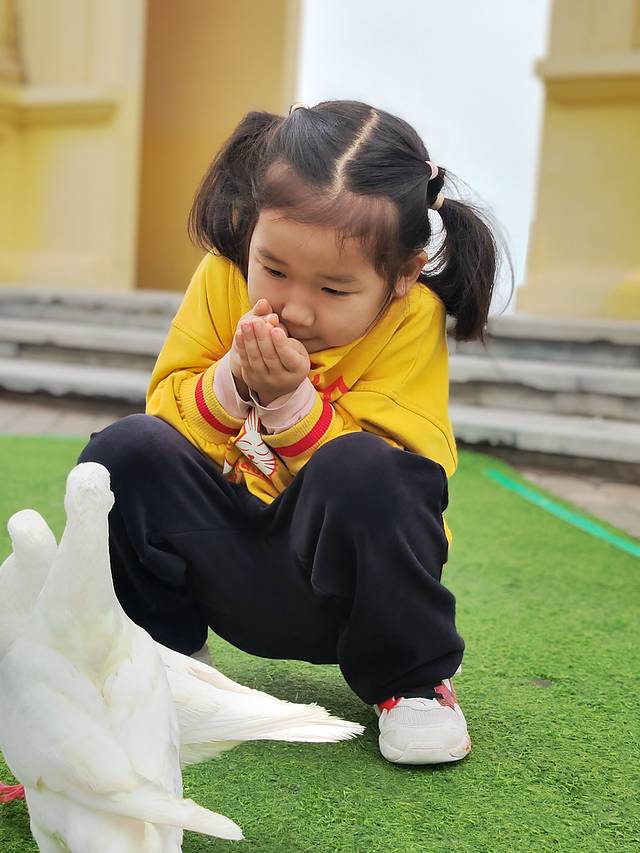 又想喂鸽子,又怕鸽子偷吃的小孩儿~