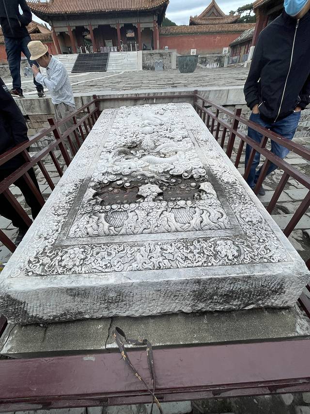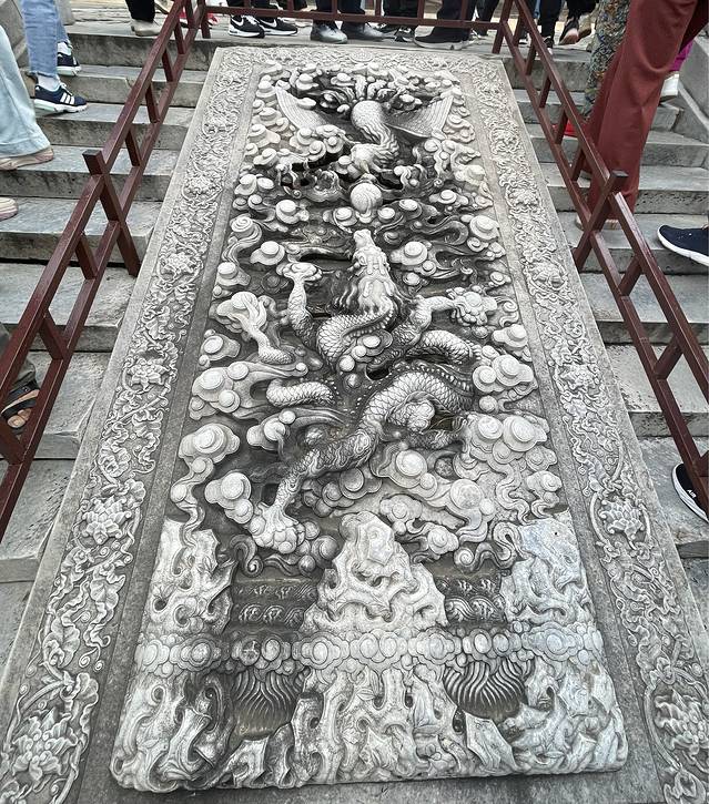 隆恩殿前的丹陛石,就是著名的“龙在下,凤在上”的那块石头。高浮雕加透技法雕成,以凤舞引龙翔,丹凤凌空,蛟龙出水,神态生动。