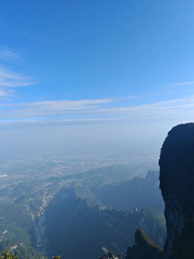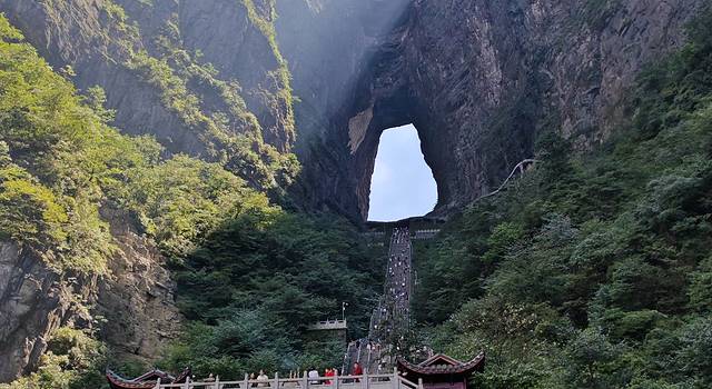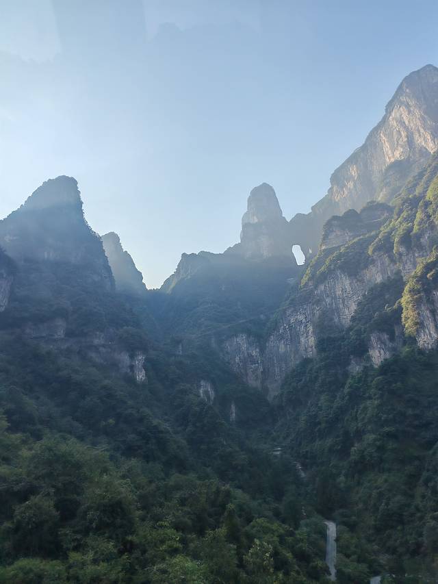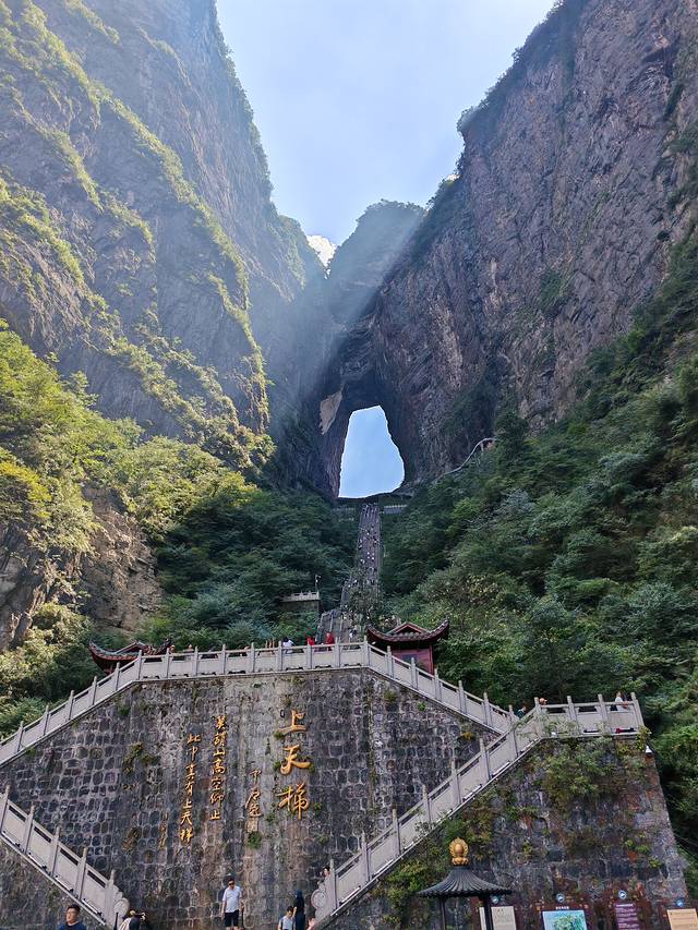 我们选择的是A线游览,按照预约的门票时间,到达天门山索道下站,大约坐了近半个小时索道到达天门山山顶。到达山顶后按照先西线再东线的顺序游览,结束后乘坐电梯下山,天门洞下到山底可以选择步行台阶,也可以补一张下山电梯票,为了节省体力我们选择了电梯下山。