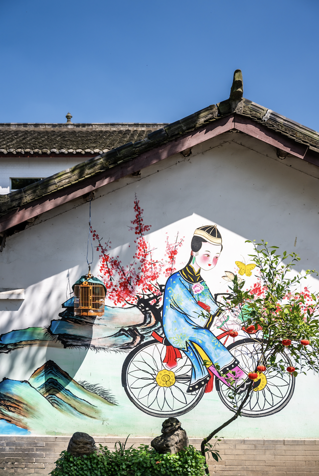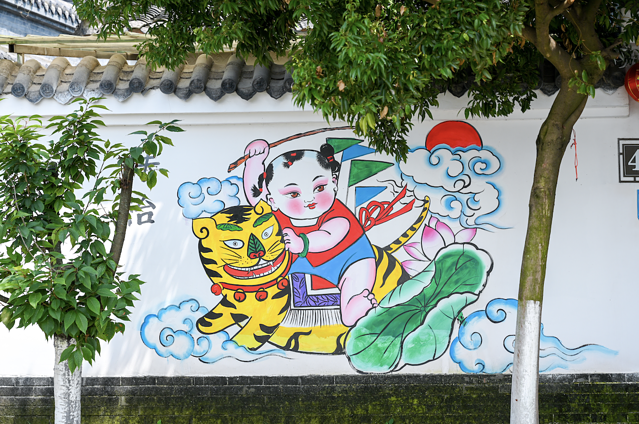 年画村里简直就是一个五彩斑斓的艺术天堂,家家户户的墙壁上都绘制着体现巴蜀人民乐观向上的生活方式和精神思想,中华传统的魅力在这里得到了完美的展现。