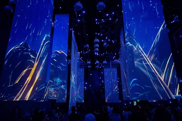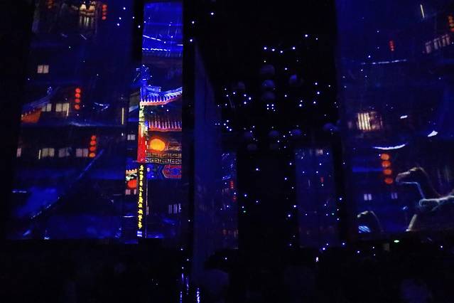 检票后进入二层演出区域。如果到得早也不用担心,这里会通过光影的变幻展示洛阳的新旧八景。提前带你走进剧情之中,让你在现实与虚拟世界之间来回转换。