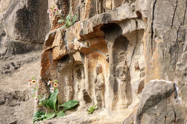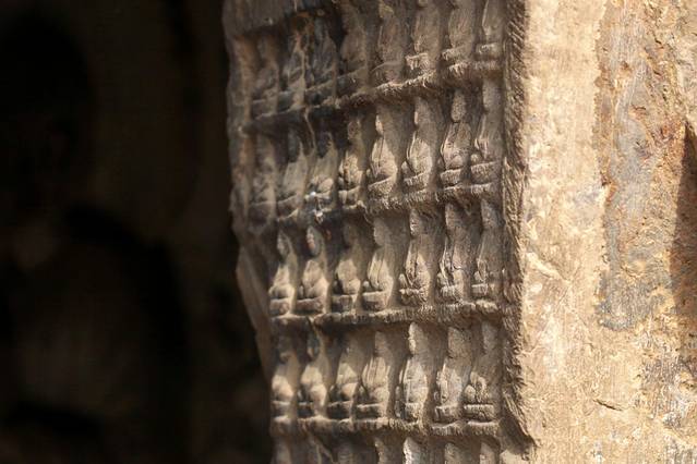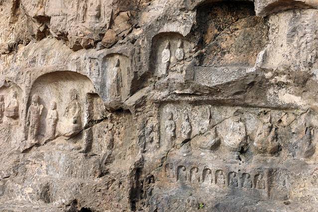 看完卢舍那大佛后,我带着朋友开启了走马观花模式。和第一次一步一个脚印、每个都看得很仔细不同,这次我更多地关注那些小石窟和小石像。它们更加灵动小巧,仔细观察的话,你会发现很多有意思的造型,雕刻的细致程度也很高。毕竟大石刻只能在栅栏前观看,而小石窟可以近距离观察。