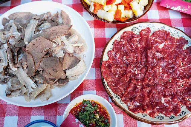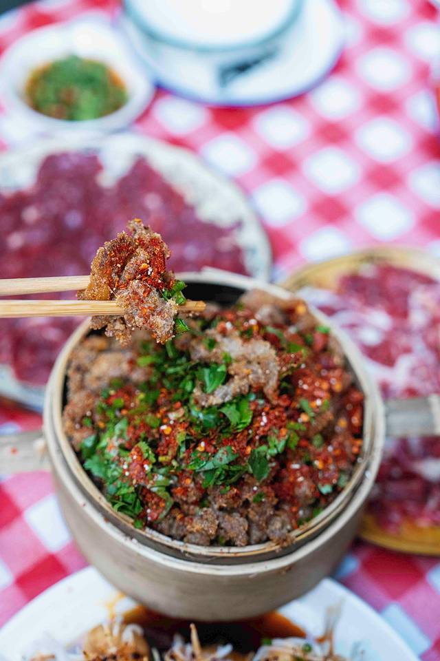 制作跷脚牛肉的关键在于特制的调料。厨师将腌制好的牛肉放在高温下快速烹调,这个过程能够锁住肉质中的鲜嫩与汁液,确保牛肉在烹饪后仍然保留丰富的口感。