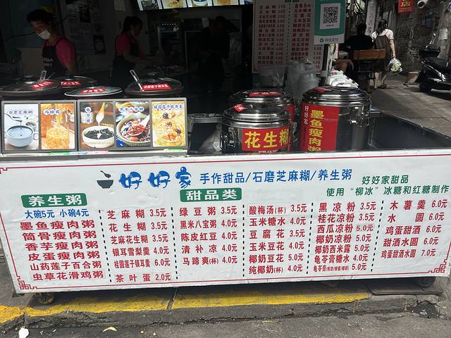 好好家糖水铺,谷埠菜市场里面糖水铺,芝麻糊花生糊双拼香浓味美,3.5元的价格让人惊叹,他家4元的咸粥也不错。