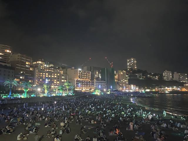 花火大会是8:20-8:45,我们本来打算8:40跑,结果日本人的严谨哪里去了?竟然提前五分钟结束,刚站起来就被大部队包围,然后裹挟着往前走了,从海滩走到车站需要15min时间,日本人走路好快,还穿着木屐,都健步如飞的爬坡。