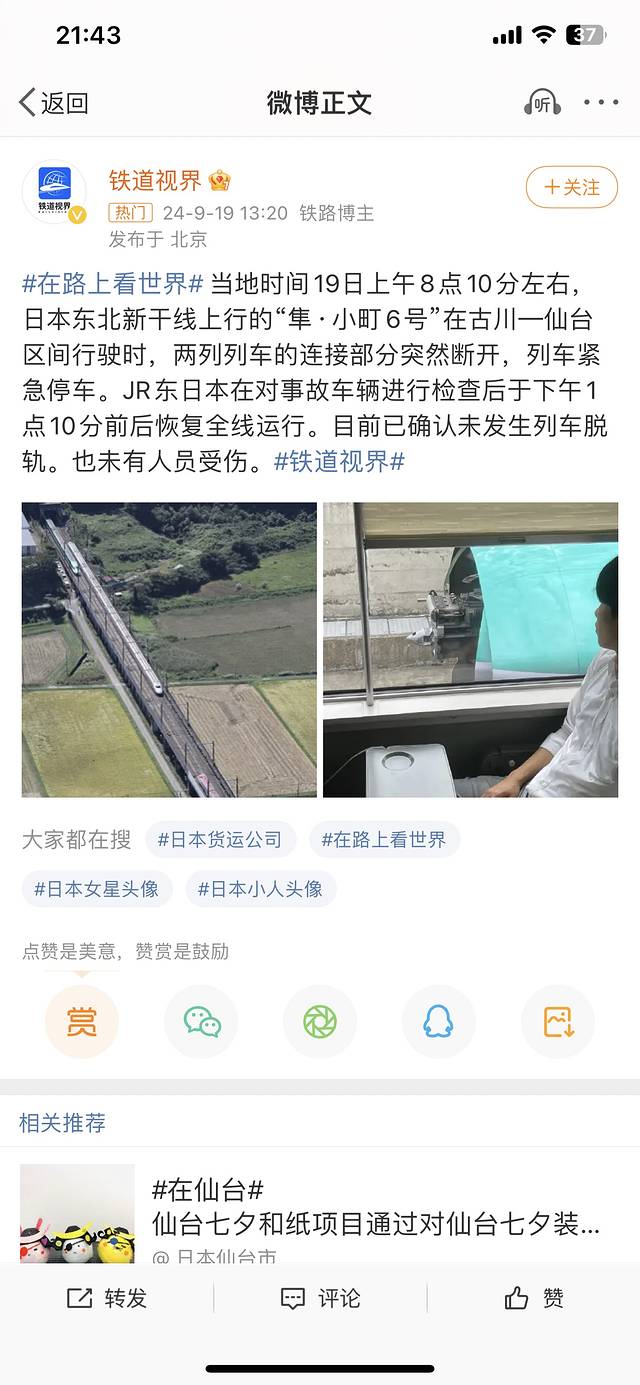 结果啊结果!起了个大早,八点就坐上jr了,8:05开出去两分钟车停了!!后来一直查推特说是因为反方向的隼号 两截车没挂上,断开了,导致青森到东京全线jr都停了。。(隼这个车又叫隼*小町,这是两截列车接起来的,东京到盛冈一起走,在盛冈分开。所以反方向的车就是在盛冈接起来一起走。)