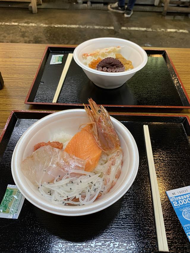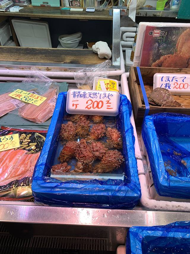 出来遗迹门口就可以坐车回市里了,中午就在很出名的青森鱼菜市场吃饭,先买券,170日元一张,然后每家档口会把海鲜标上需要几张券兑换,就可以吃到很多档口的多种海鲜