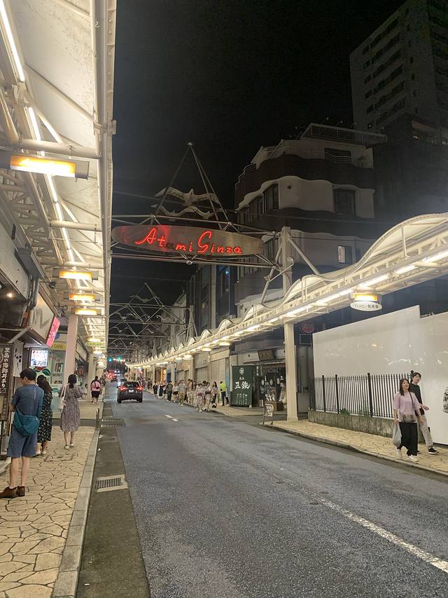 存好行李后我们就溜达到海边,一路上经过商店街和诸多居酒屋,人都特别多要等位,我们就想找个人少的地方吃饭,结果从五点多溜达到七点多,都没找到,热海地方不大,好多店还闭店或者满客
