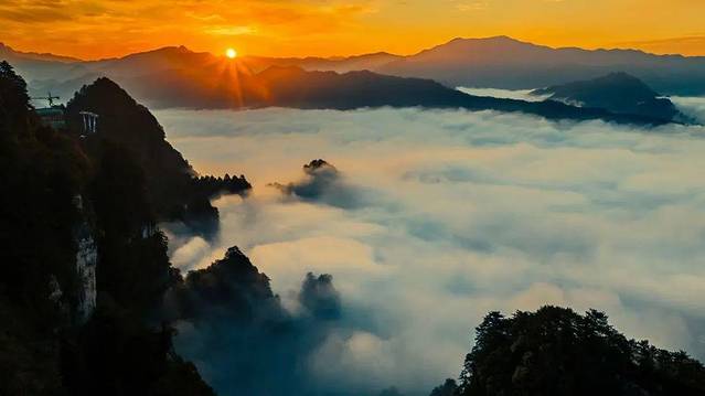 下索道后,需要继续走一段路到达山上的观景处,看日出云海的最佳位置有三个,分别是云天飞燕观景台、万笏朝圣观景台、七女峰观景台。不同的点位,可以欣赏到不同变幻莫测的云海。