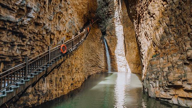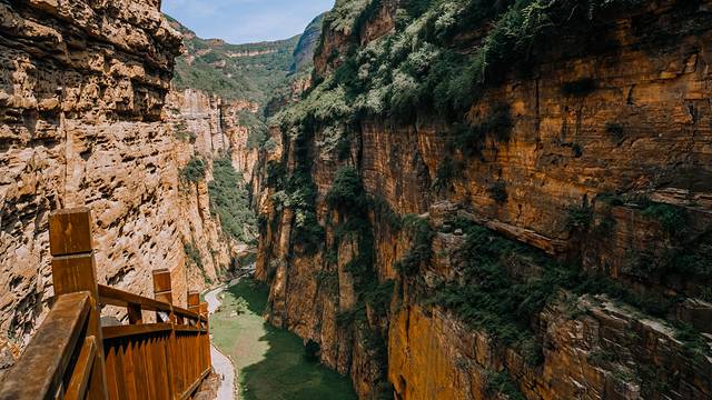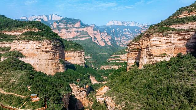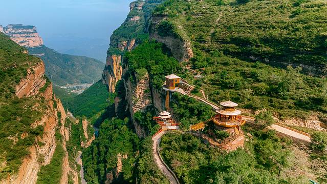 有没有想过坐电梯爬山?1分钟从山脚下爬上山顶?在黄崖洞,电梯钻进了大山里,一半悬空在山体之外,一半穿行山体之间,120米的电梯悬挂与峭壁之上,光是看看,就觉得很刺激呢!