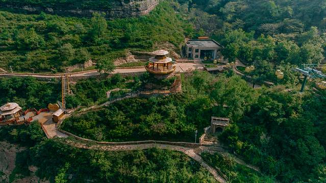 但相比于其他景区的缆车,黄崖洞的缆车更有设计感,它将缆车站架设在了一座座莲花台之上,上帝的视角看下来,就想在一朵朵盛放的莲花间开出的缆车,唯美如画。