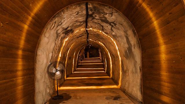 电梯出来往山里走的通道,也有如防空洞一般,传承着黄崖洞骨子里的红色基因。