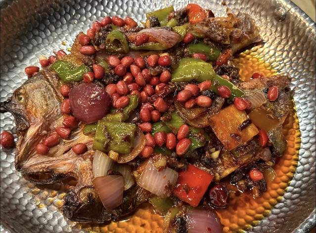 东巴烤鱼 选用的是新鲜的鲈鱼,外皮烤得酥脆,内部鲜嫩多汁,鱼肉细腻且带有微微的香料气息,每一口都让人赞不绝口。
