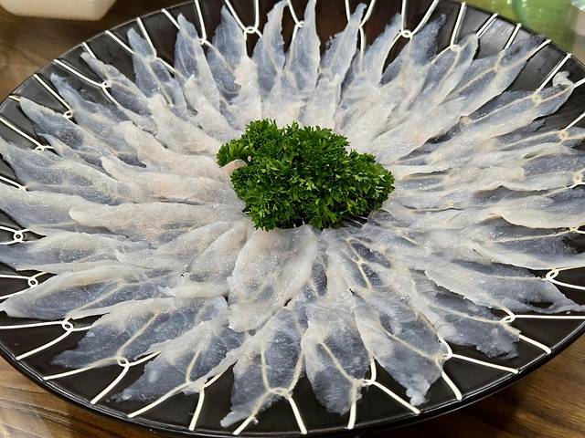 即生鱼片。白色透明的河豚生鱼片 , 能透出盘子的底色。不同的装盘方法, 称为「鹤盛」 。河豚鱼肉质紧实, 富有弹性, 口感滑嫩。做刺身的时候要尽量地切到薄如宣纸 生鱼片所蔬的佐料以酱油、醋、葱、萝卜泥、柠檬为主。
