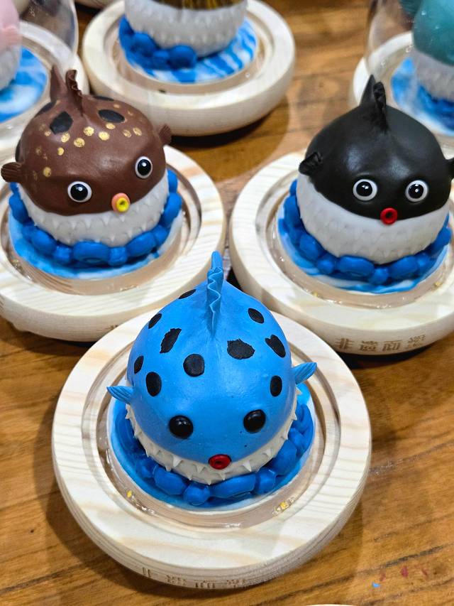 在十里海的河豚小镇可以体验非遗。面塑这玩意儿简直就像魔法一样!用日常吃的面粉、糯米粉,再加上一点点甘油或者澄面,混合成超Q弹的面团。可以捏成不同形状的艺术品,现在已经是非遗文化了,从汉代开始就有记载啦。