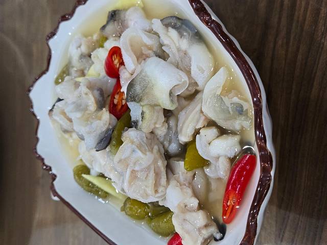 完全用河豚鱼骨鱼肉熬制而成,牛奶一般的白汁锅底,汤汁醇浓,口味极仙。白汁河豚皮肥肉嫩,温润鲜美十足。