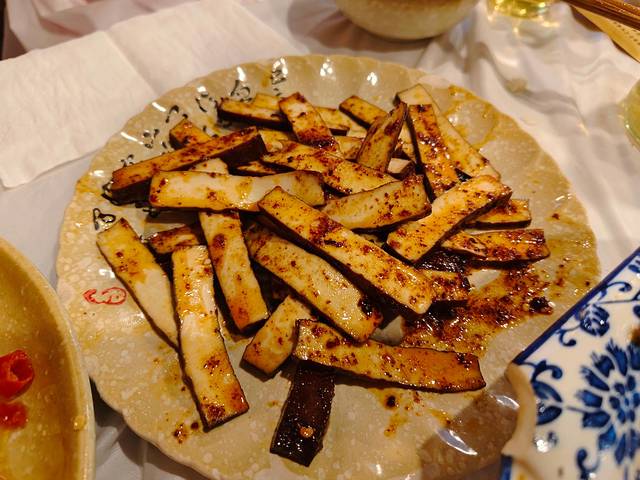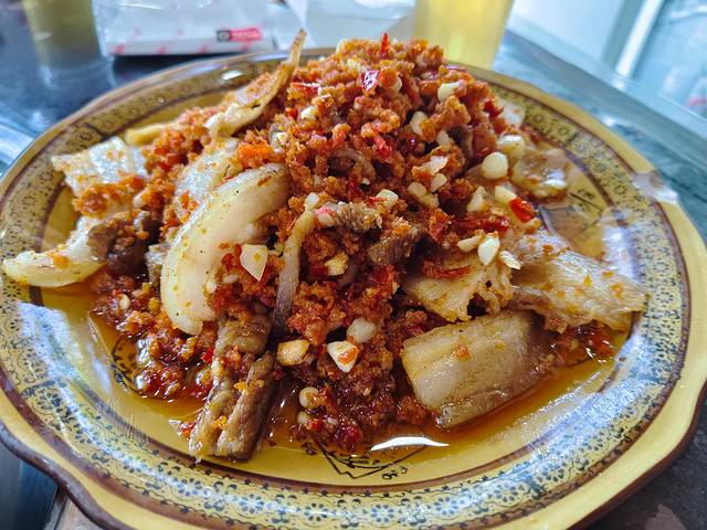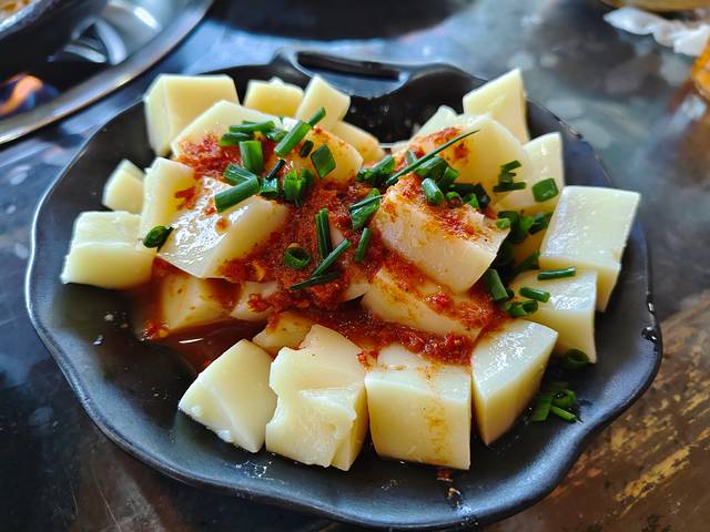 米豆腐是当天这桌菜上剩的最多的,真的是罪过啊。米豆腐这东西东北也是没有的,应该是用糥米制作的吧,口感没的说,Q弹绵软,但是我觉得失败在浇头太单一了,只有点咸味的辣酱,显得口感寡淡,我个人觉得还不如切小块放奶茶里或是做甜品,完全就是布丁的健康平替,应该会很受欢迎。。。当年刘晓庆在”芙蓉镇“里做的就是米豆腐,不知道滋味如何。