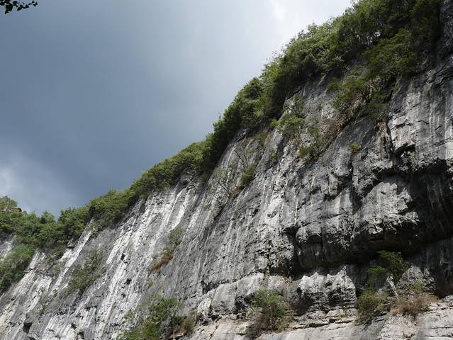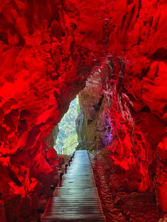 蒲花暗河景区一进入后,就是一个有如天坑的巨大坑洞,我们需要沿悬崖石壁一路下行,抵达洞底才能乘船游览。