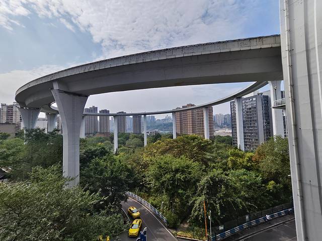 出了菜圆坝,花上2元钱,乘皇冠大扶梯上两路口,在两路口乘公交车,上苏家坝立家桥,体验20层楼高的立交桥,然后再步行到铜元之光城市阳台上俯瞰重庆两岸的景色,最后圆老姐的一个梦想,去李子坝打卡。