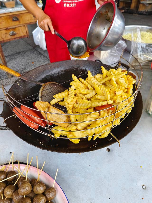 因为早上饿着肚子从龚滩出来,本来以为在路上可以吃点当地特色的早点,但是事实确很残酷,走了好多个村镇也没有看到什么早餐店,后来在双泉镇遇到了一个孃孃开的炸洋芋,买了些炸货果腹。