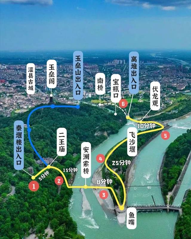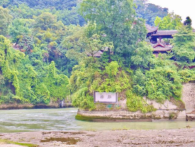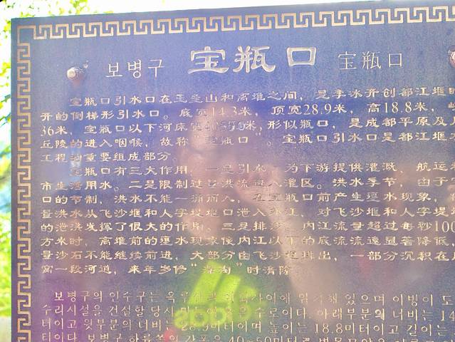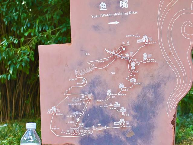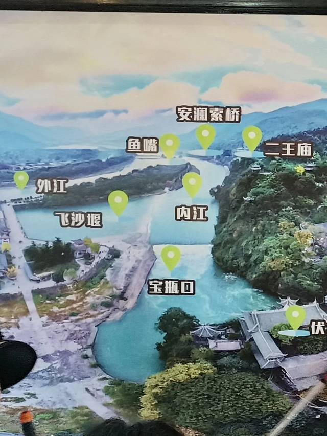 首先,岷江通过鱼嘴(其实是🐊的👄)分流,之后内江流经飞沙堰,飞沙堰运用凹凸面的原理进行排沙。飞沙堰下沉四根卧铁,是每年挖沙除沙的指标,工人们在枯水期挖到四根卧铁即可停止。最后,内江流入宝瓶口,分出若干支流,流入成都平原进行灌溉。