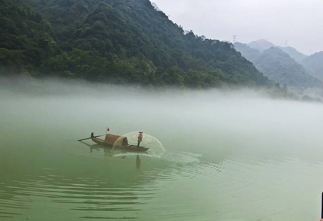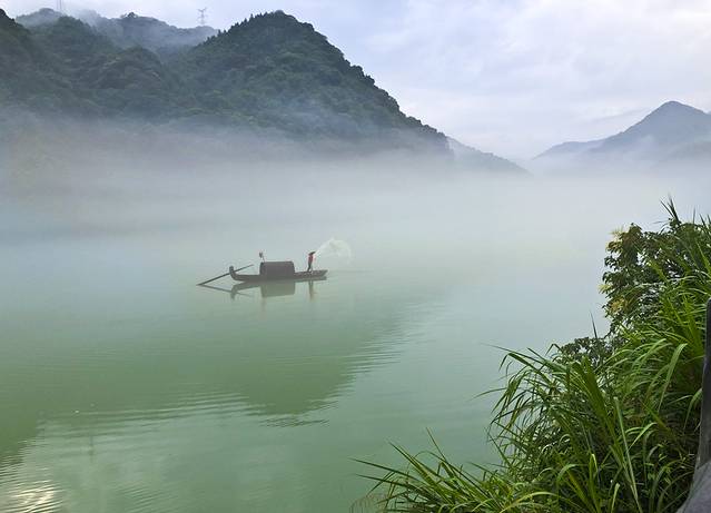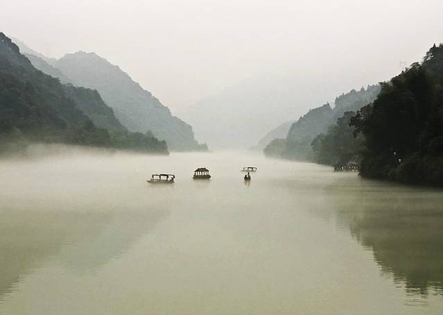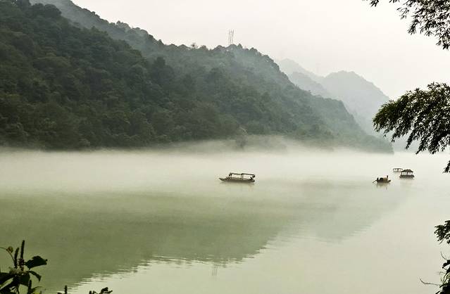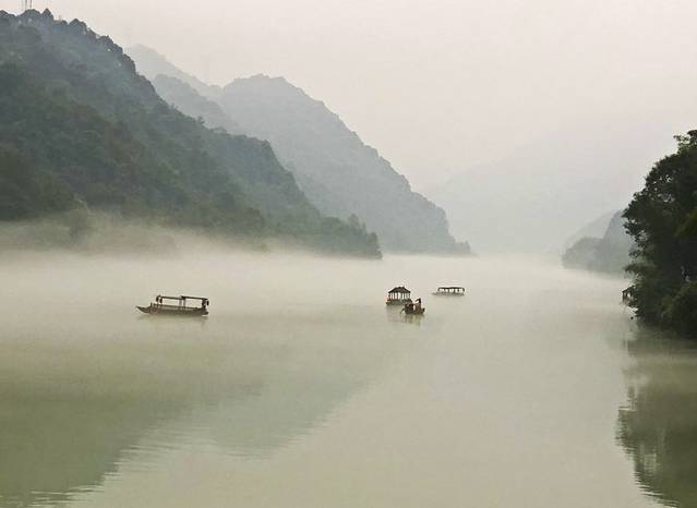 先在2号观光点下车,此刻的雾有点大,弥漫在水面和对面的山峦上,朦胧飘乎,仙境般漫妙。沿江慢慢向3号点走,一会儿就看见云雾中出现了几条小船,这是景区安排的,很是增加了景观的灵动和观赏效果。