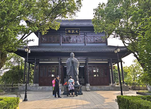 东洲岛景区也不小,全长有近2公里,从廊桥进去后东边基本都是游乐园,小店等,最东头有个新建筑夫子楼。王夫之(1619-1692),晚年隐居石船山,故后人称之为“船山先生”,是明末清初的杰出思想家、哲学家、文学家,与顾炎武、黄宗羲并称明清三大思想家。