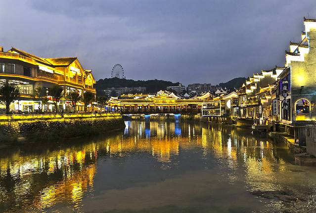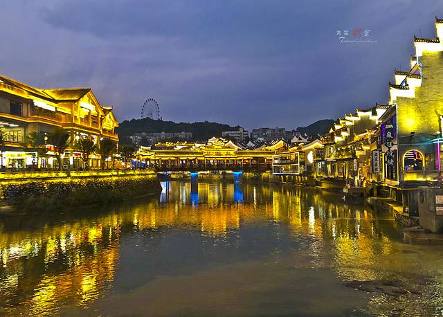 这时天终于黑下来了,天空是最漂亮的蓝调时间,便开始个个角度拍照。眼前的古屋小巷,在灯光的映衬下美仑美奂,倒映在河水中的小桥和民居更是唯美无限,韵味无穷呢。拍了许多张片片,又在河边站了老半天才恋恋不舍地离开。