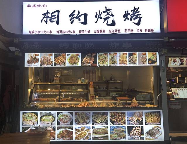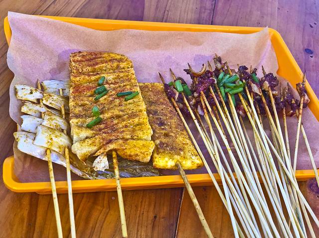 为了等时间,买了绿豆茶和糖油粑粑,坐在桥上慢慢吃着。又找了找也没什么其它当地特色小吃了,最后还是吃了一家的烧烤,要了几串,吃饱了才20多元,而且味道不错。