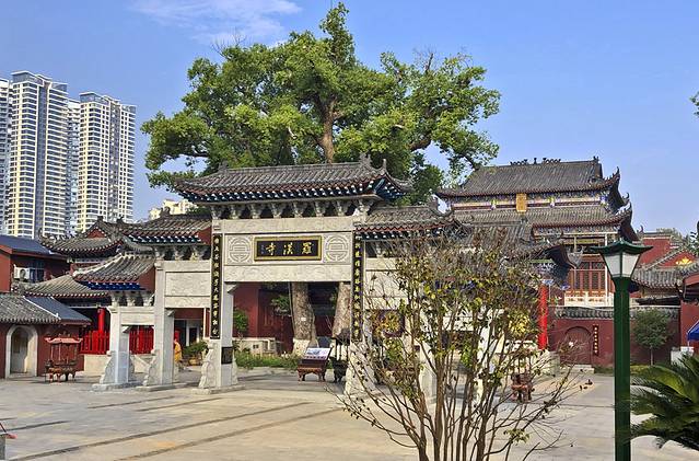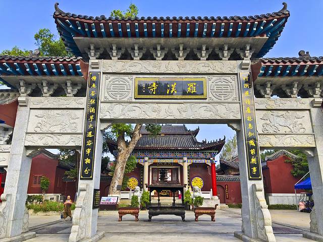 最西边是个罗汉寺,始建于明朝末年,经过多次修缮,现在是湖南省重点宗教活动场所。山门口有个老尼。寺内有大雄宝殿、天王殿、钟鼓楼、罗汉堂、藏金阁等建筑,雕梁画栋,庄严肃穆。罗汉寺内供奉有500多尊罗汉像,还是电影《疯狂的石头》的取景地之一。 2015年罗汉寺进行了重修,满眼是熠熠生辉的新建筑,不知没修之前是什么样子。