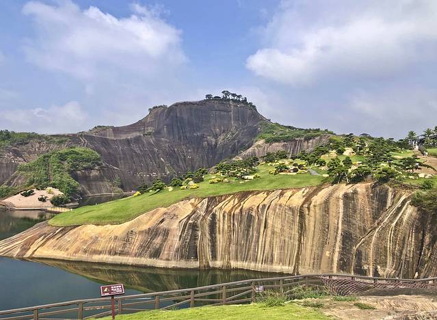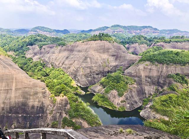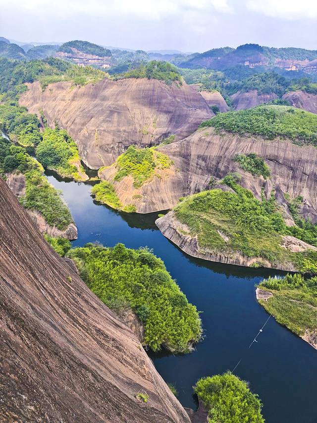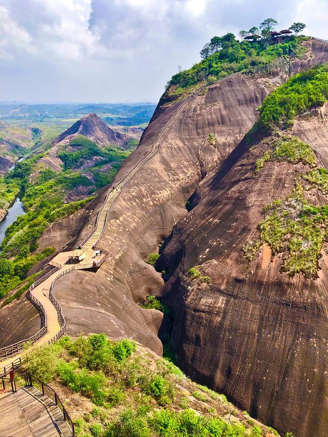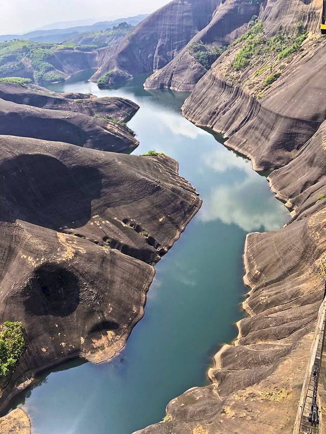 然后就开始登天云梯,好在可不必爬上顶,从半山腰的栈道过去就完成了,感觉还不是太艰难。但过去的下坡好长好长,虽然省力但很考验膝盖。终于下来了,这里是一个摄影点儿,就着凉棚的荫凉稍坐一会儿。这个景区的这一边山高费体力还没有树,全是岩壁无荫凉。但眼前的景色非常不错,还没到核心景区就已经很让人惊叹了。