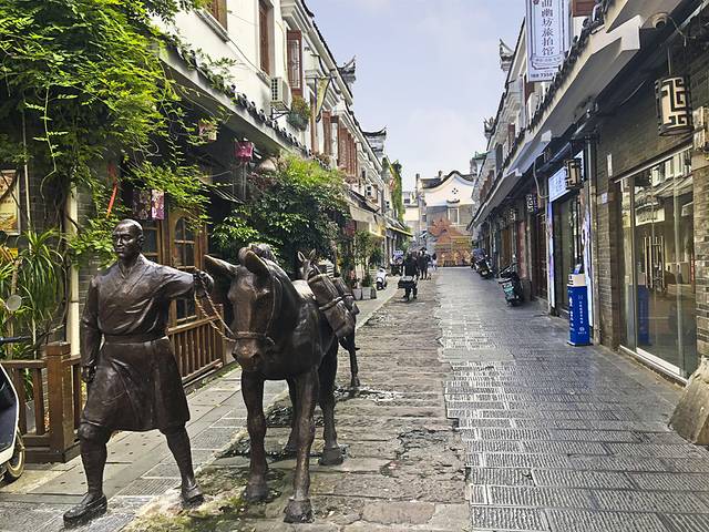 青石板道两边是典型的青砖灰瓦马头墙,古道上的骡马铜像形态各异,表现得应该是骡马古道吧。