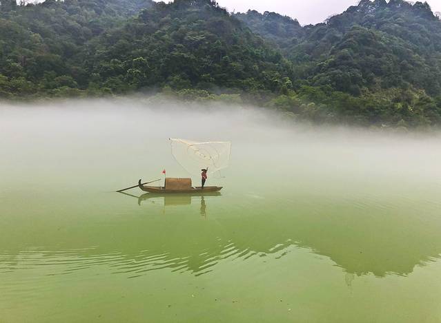 慢慢出现了一些蓝天,逗留在3号和4号中间的撒网点欣赏拍照。蓝天越来越多,对面山顶的太阳渐渐冲出云层,洒下一片金光,这时,眼前的画面就完全变了,从朦胧梦幻一下子变成靓丽惊艳,这束阳光给小东江的清晨注入了灵魂一般。云蒸霞蔚的炫目奇景终于被我等到了,心中一阵狂喜,没遗憾没遗憾了。赶紧拍下这明艳灿然的画面。