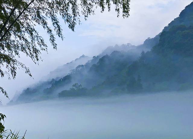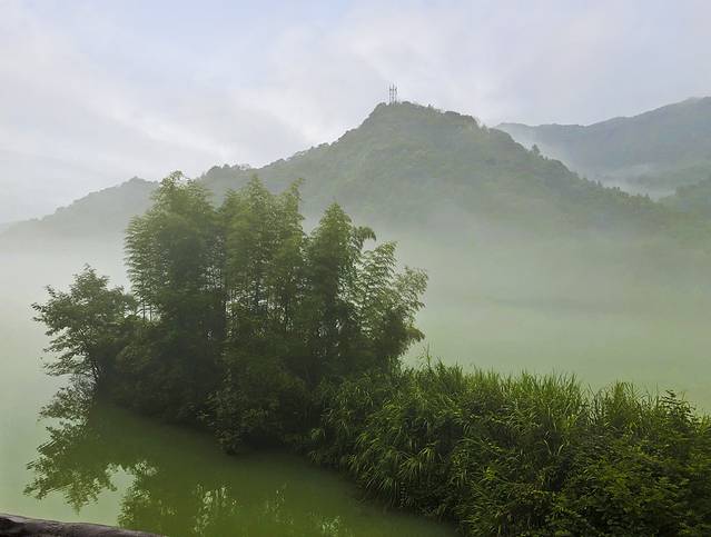 早7:00又进景区,只买张15元观赏车票,看看雾就好。在3号点下车,今天的雾比昨天漂亮,天空也更亮些,弥漫在江面的雾层较低,山峦中间的雾飘渺撩绕,浓淡相宜,婉如名家笔下的山水画。