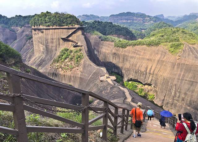 暗红的崖壁被雨水冲刷出一道道黑迹,红黑相间中给人无限苍凉之感。本是原生态天然之地,如今却招来这么多游人欣赏赞叹。本是光滑的山壁生生开凿出串串台阶和栏杆。好吧,不如此我又怎么能来欣赏这奇丽地貌呢。