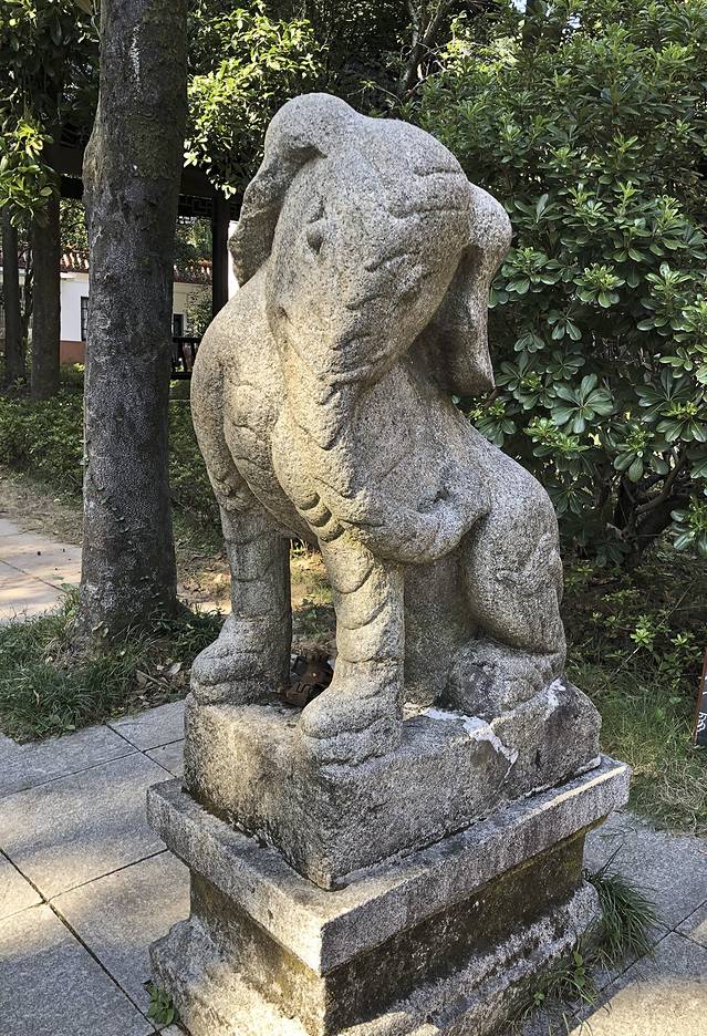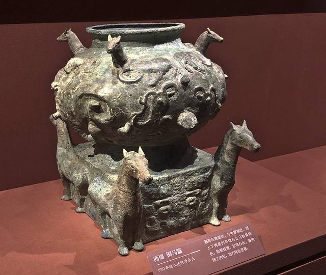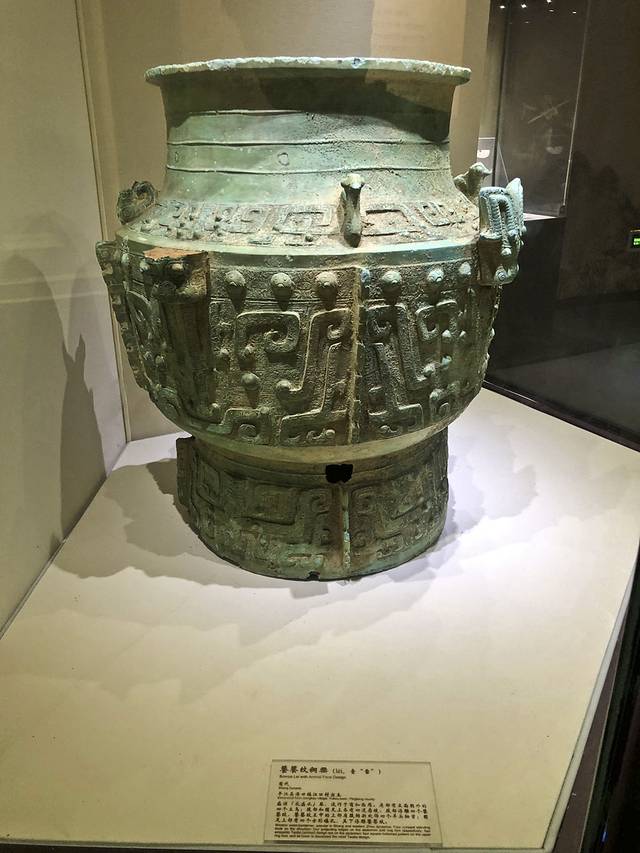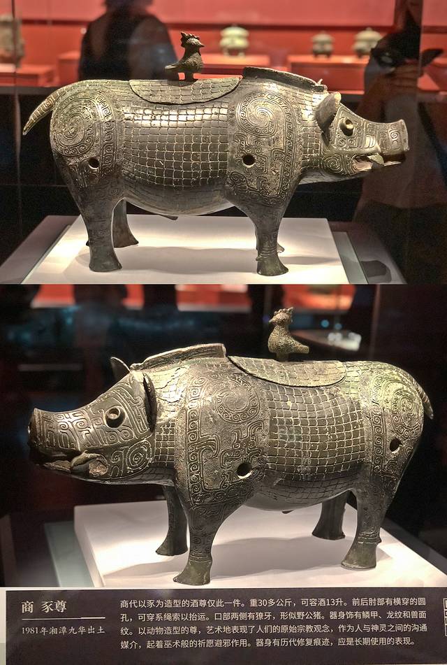 商代豕形猪尊商代豕形猪尊高40,长72厘米,于1981年在湘潭县九华公社桂花大队船形山(今湘潭市雨湖区)出土。湘潭九华出土的猪尊作野公猪形状,有盖,盖上捉手残缺,根据残存情况复原成凤鸟形。双眼直视,獠牙外露,两耳竖立,四肢粗壮,尾下垂。肘部前后各有一圆形管孔,经过尊腹,直通另一肘部。此管应是先铸,然后安装于豕尊范中铸造的。此器重达30多公斤,容积有13公升,盛满之后,一个人难以搬运,有此管孔,可以穿系绳索,供人抬举,安装此管的作用是便于人们搬运。猪尊的装饰也有特点,器身大面积用鳞甲纹,前后肘部饰夔龙纹。造型很可爱,最后出馆前在文创店就买了它的纪念品。