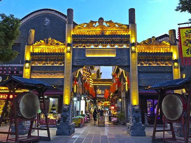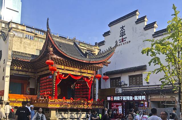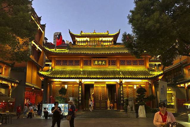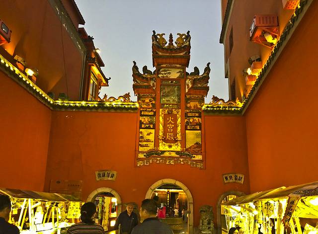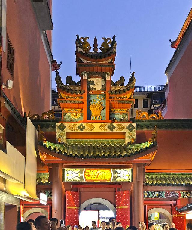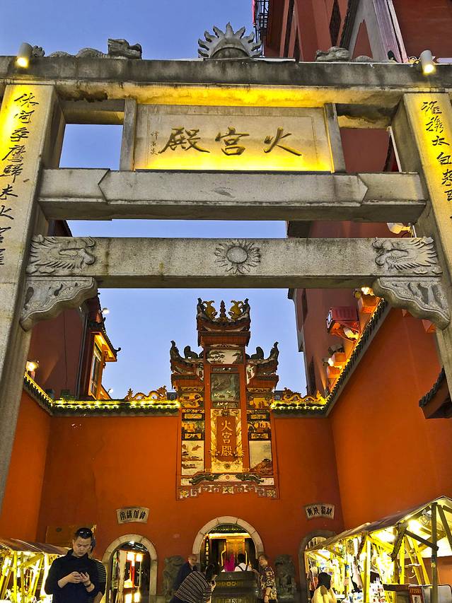 吃完饭时间差不多了,灯光也全亮了,便拍了几张老街夜景,还是很漂亮。然后走到不远的坡子街,是条较宽的街道,两边全是明亮灯光的大饭馆,走一点就见到了火宫殿,很漂亮的一个红墙老院子,山门、院内的大殿及两侧的装饰,在灯光的装点下美仑美奂,真是超出预期了,原一直没太明白这个火宫殿究竟是景点还是饭馆?现在来了才知道即是可观赏的古建筑,又是著名的老字号小吃店。庆幸刚才多走走到了这里,之前并没想着一定要来呢。