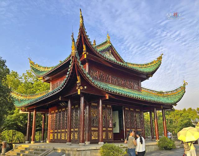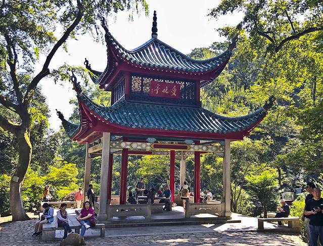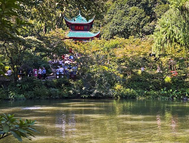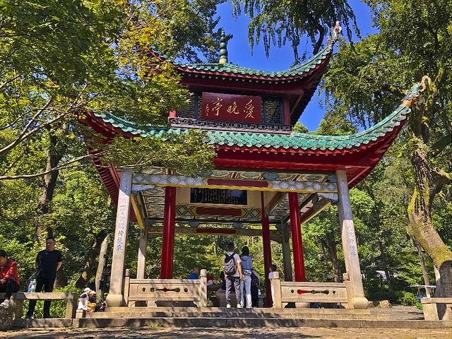 爱晚亭那红绿相间的色彩早早进入眼帘,造型秀美灵动。爱晚亭原名红叶亭,又名爱枫亭。后来由湖广总督毕沅,根据杜枚“远上寒山石径斜,白云深处有人家。停车坐爱枫林晚,霜叶红于二月花”的诗句,更名为爱晚亭。爱晚亭同样是几经沧桑,清同治、光绪、宣统年间均相继进行过修复。