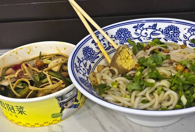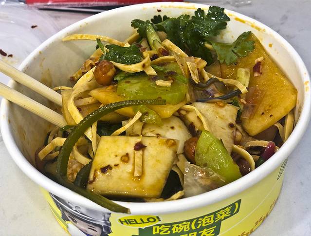 出来找吃的,见到对面有个泡菜小店,除了泡菜还有许多样菜,挺适合我,便称了几样15元,又到旁边粉面馆要了一碗粉,加个卤蛋就着泡菜吃真不错。