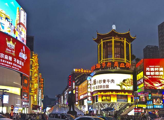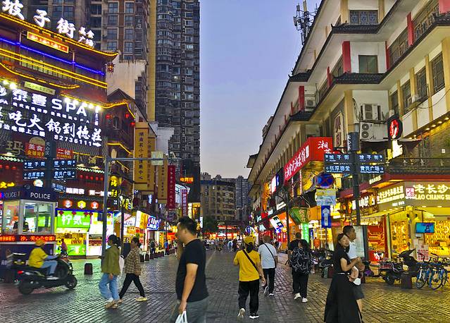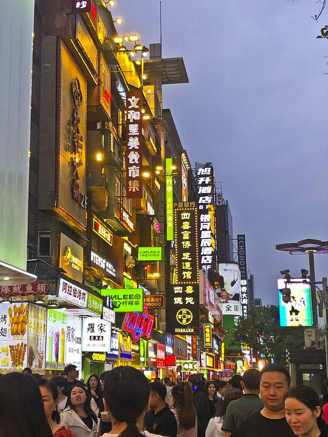 累了坐了一会儿,之后按地图很快出来这片街巷就是黄兴步行街了。今天是周日,天也黑下来了,街上人非常多,两侧全是各种店铺,食品居多,其中的湖南酱鸭店最多,有各种口味,不断的叫卖还可品尝,还真好吃。可非要100元4只,我只想少卖点吃却也不能够。